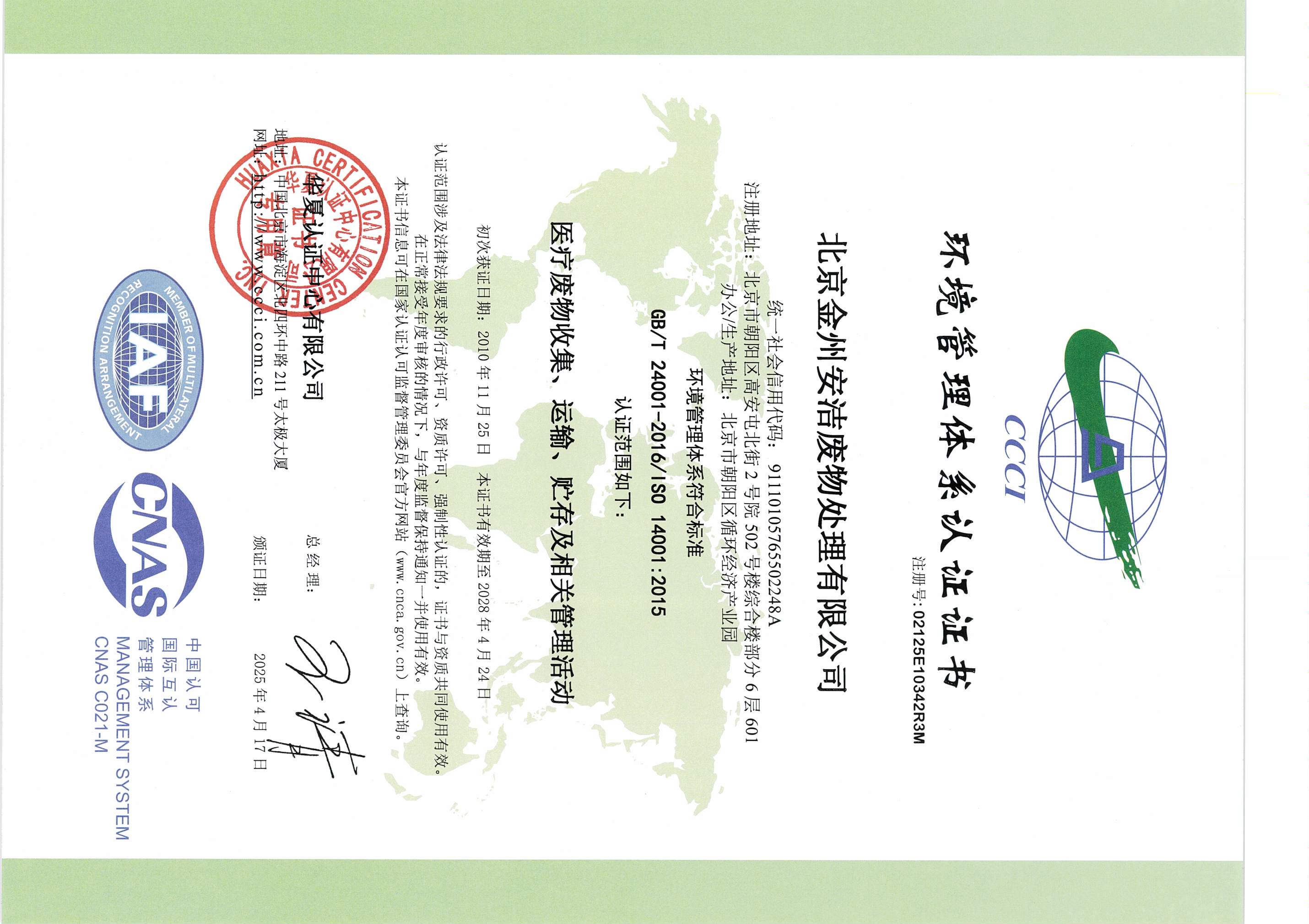 环境管理体系认证证书