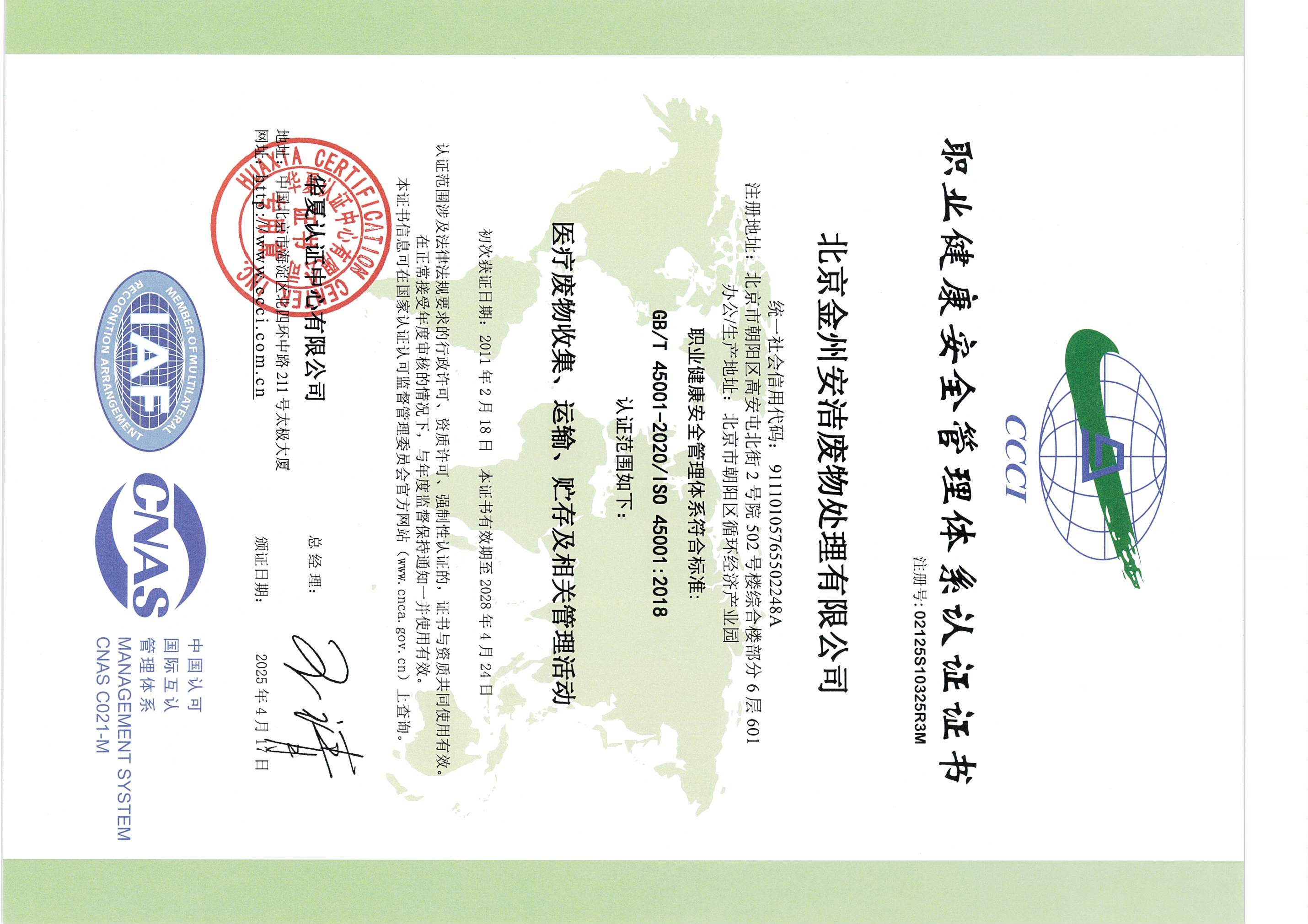 职业健康管理体系认证证书